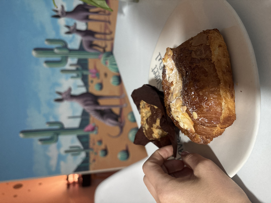 A white plate holds a croissant adorned with sliced almonds and a small, wrapped pastry. A hand reaches for the pastry. The croissant is golden brown and appears fresh. The background features a colorful wall or poster with a desert scene including cacti and kangaroo-like creatures. The focus is on the pastries on the plate.