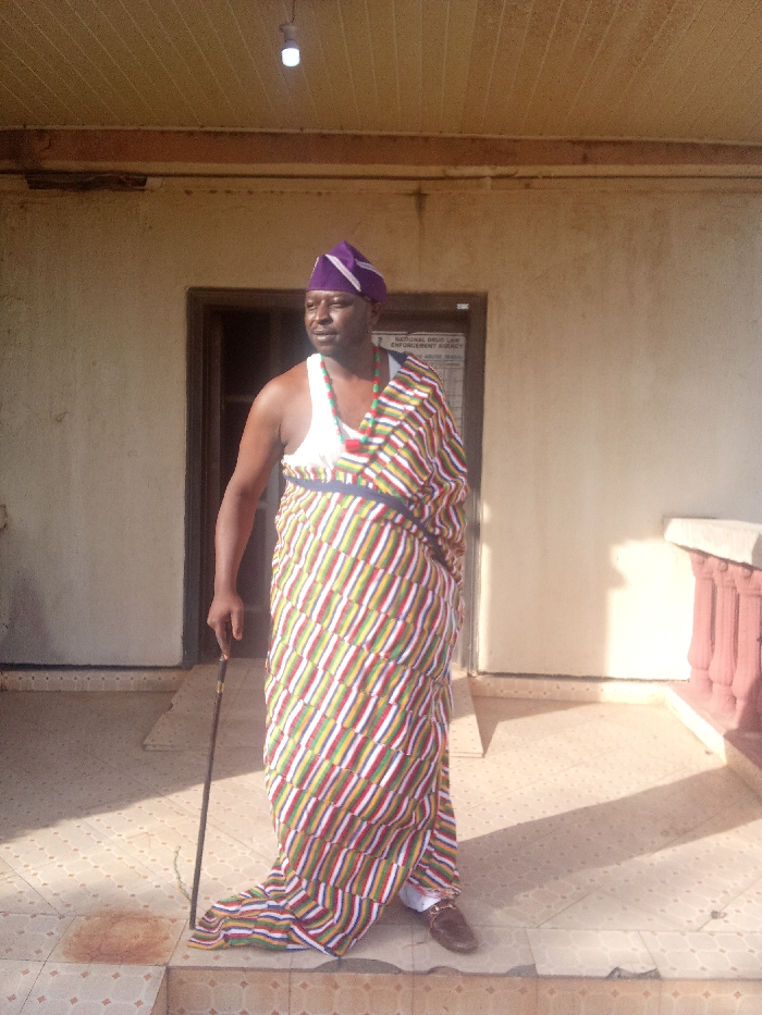 A man stands on a tiled porch, dressed in traditional African attire. He wears a purple hat, a white undershirt, a colorful woven wrap, and brown shoes. A beaded necklace adorns his neck. He holds a walking stick in his left hand. The background features a building with a door and a white wall. A light fixture hangs from the porch ceiling.