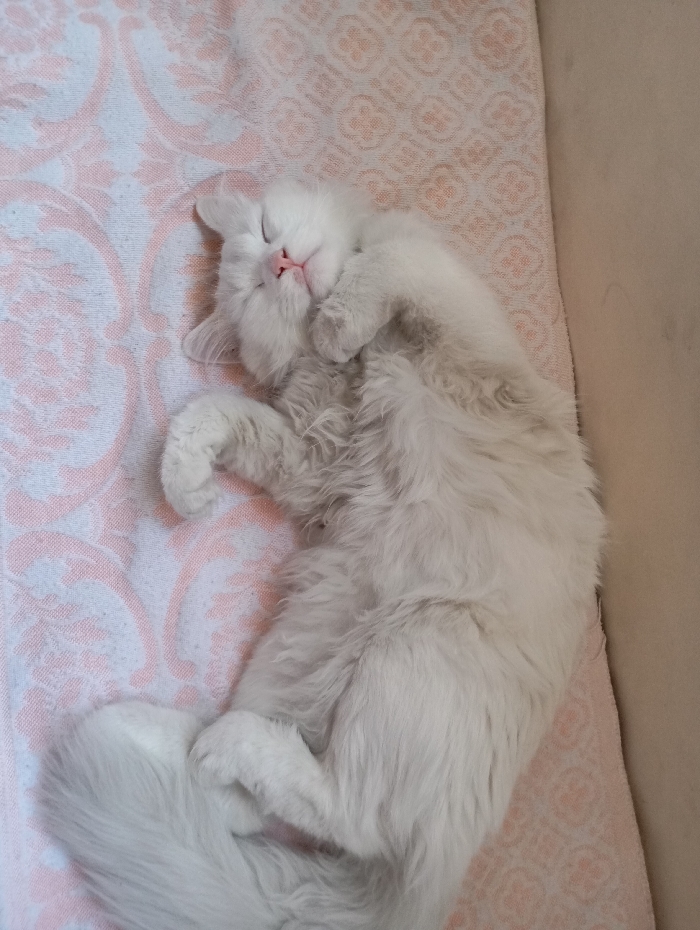 - "A white, long-haired cat is depicted sleeping on its back, curled on a light pink and white patterned textile" by FM-uNgLB2, licensed under CC BY 4.0