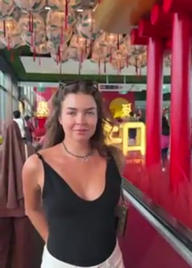 A woman stands on an escalator in a brightly decorated Asian-themed environment. She wears a black tank top, white shorts, and a necklace. Sunglasses rest on top of her head. She is light-skinned with wavy brown hair. She poses for the camera, smiles, and adjusts her hair. Above her are many rounded lanterns hanging from the ceiling. To her right is a red decorative structure resembling a traditional Asian gate. In the background, other people are visible, some wearing hijabs. The floor and side of the escalator are red. Large, golden Chinese characters are visible behind her.