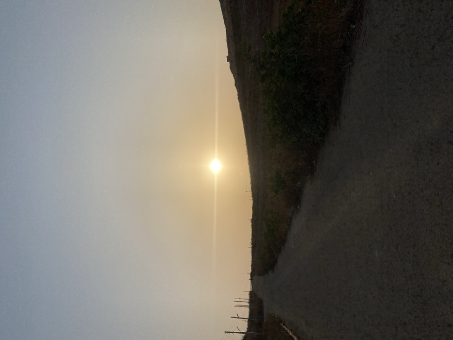 The image displays an outdoor, undeveloped landscape during either sunrise or sunset. The sky transitions from a light blue at the top to a hazy yellow-orange near the horizon, dominated by a bright, low-lying sun with a prominent horizontal lens flare extending across the frame. A dark, unpaved road occupies the lower left quadrant, curving gently uphill and leftwards into the distance. Along the left edge of this road, several utility poles with visible crossbars and lines recede sequentially. The right side of the scene features an upward-sloping embankment or hill covered in sparse, dry grasses and sporadic green shrubs in the foreground. A small, dark, indistinct structure is faintly visible atop the distant hill on the right. No individuals, vehicles, or discernible human activity are present. The dry vegetation and unpaved infrastructure suggest an undeveloped or peripheral area within or surrounding Abuja, Nigeria, consistent with a dry season environment.