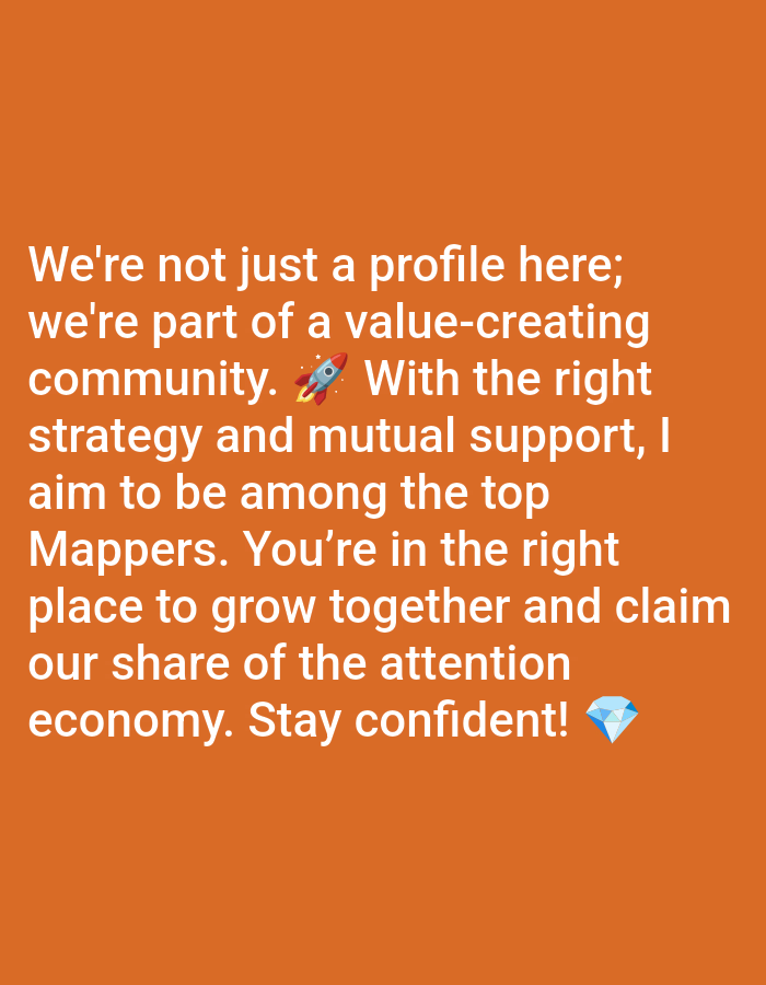 The image is a digital graphic featuring white text and two emojis against a solid, vibrant orange background. No physical location, individuals, or real-world objects are depicted within the image itself; therefore, no information regarding a specific city like Karlsruhe, Germany, or a physical environment can be ascertained from the visual data. The white, sans-serif text is centrally aligned and reads: "We're not just a profile here; we're part of a value-creating community. 🚀 With the right strategy and mutual support, I aim to be among the top Mappers. You're in the right place to grow together and claim our share of the attention economy. Stay confident! 💎" A red, blue, and yellow rocket emoji (🚀) is embedded within the text, positioned after the word "community." A light blue faceted diamond emoji (💎) appears at the conclusion of the final sentence, immediately following "confident!" The graphic communicates a motivational message pertaining to community, growth, and confidence, using only textual and symbolic elements.