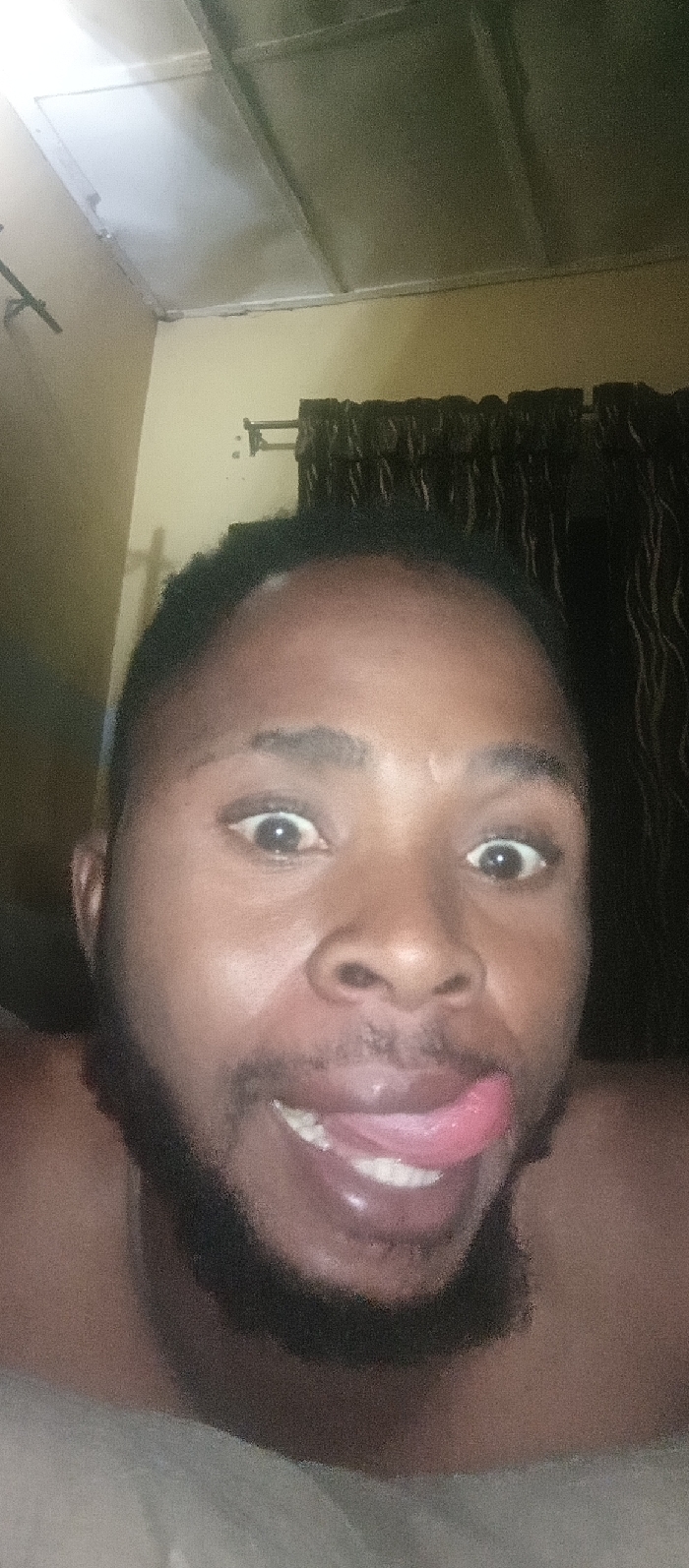 A close-up selfie of a dark-skinned man with a beard sticking his tongue out. He has wide, surprised eyes. The background shows a ceiling, part of a yellow wall, and dark, vertically draped curtains. The lighting is dim, and the overall image has a somewhat grainy quality.