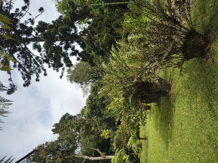 The image depicts a verdant, cultivated outdoor environment under an overcast sky. In the foreground, a uniformly mown lawn of bright green grass extends across the lower half of the frame. A diagonal row of at least three bushy plants, characterized by dark, stout trunks and dense, green fern-like fronds, is positioned from the lower-right toward the center-left. The midground and background are densely populated with various trees and shrubs, forming a thick canopy of diverse green foliage. A prominent, tall conifer-like tree with a dark, textured trunk and visible branches stands on the right side, extending into the upper frame. Portions of large fern fronds are visible along the very top edge of the image. The sky is light grey, indicative of overcast conditions. No human subjects, animals, or identifiable man-made structures are present within the scene. The precise location within the city of Unknown, Vietnam, cannot be determined from the provided visual information.