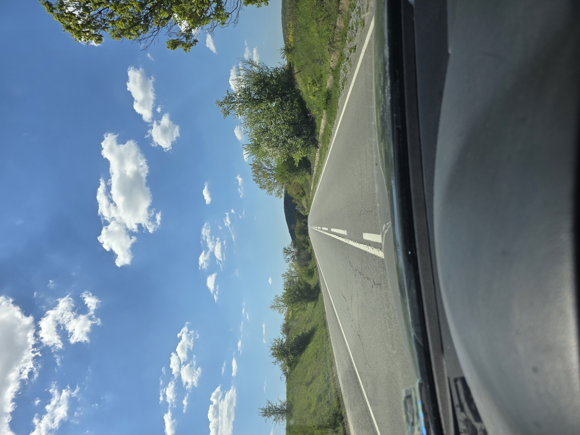 n asphalt road winding through a rural landscape, possibly near Krushevets, Bulgaria. The road has a broken white line marking the center and green grass and trees alongside it. A bright blue sky with scattered white clouds is visible above. The view is likely taken from inside a vehicle.