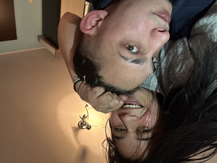 The image depicts two individuals, an adult female and an adult male, in an indoor setting within the city of Kastel, Bulgaria. The female, positioned behind and slightly above the male, presents with dark, long hair partially obscuring her face. She is smiling broadly, with teeth visible, and wears a light-colored, possibly grey, textured garment. Her visible right hand, adorned with a small tattoo on the index finger and a heart outline on the inner wrist, along with a beaded bracelet and a charm bracelet, is grasping the hair on the top of the male's head. The male, in the foreground, has short, dark hair with faded sides and prominent brown eyes, looking directly at the camera. He displays some skin blemishes on his cheek and wears a dark-colored garment. The background consists of a light beige wall on the upper right, featuring a multi-bulb, warm-toned wall sconce. To the right of the sconce, a light blue wall with a wooden trim near the ceiling is visible, along with a dark, vertical panel or door on the far right. The interaction appears playful.