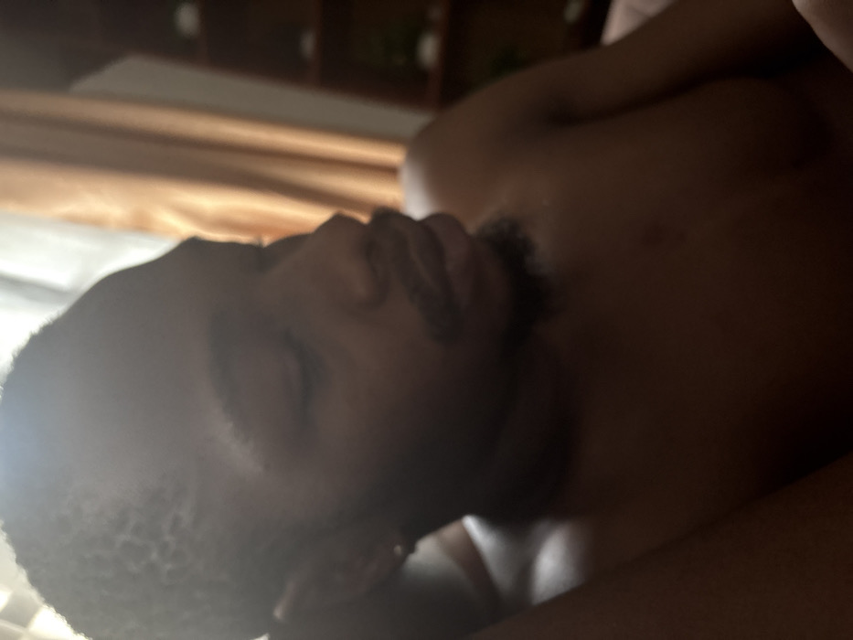 A man sleeps shirtless, angled toward the viewer. His eyes are closed, and he has short, curly hair. His skin tone is dark. A window and light-colored drapes are slightly visible in the background. The overall lighting is subdued.
