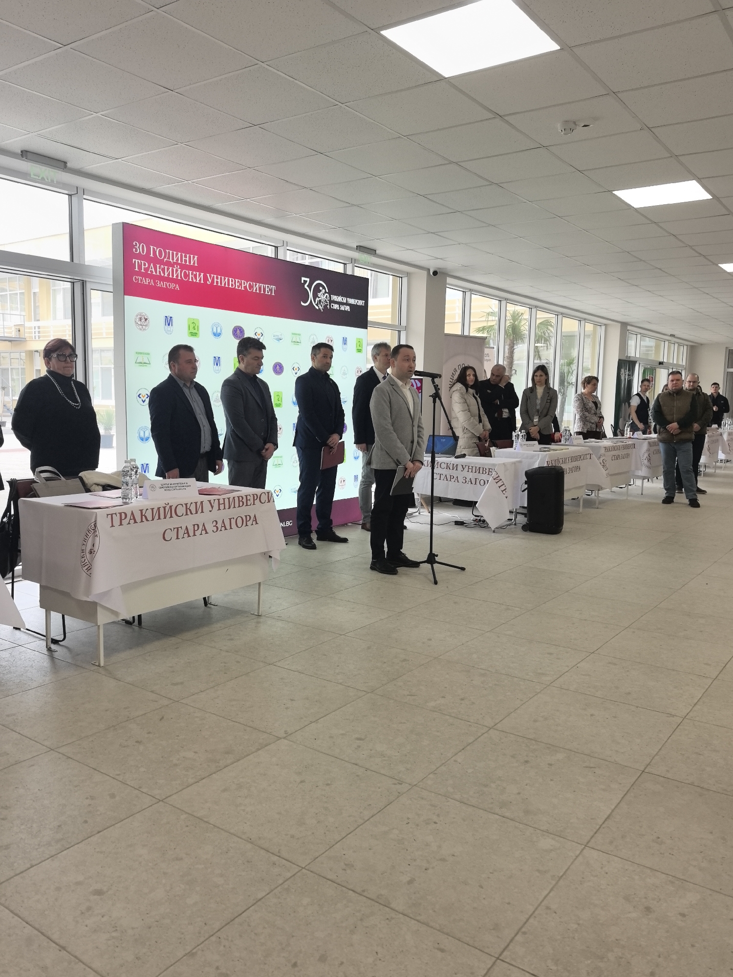 group of approximately 15 people standing behind several tables in what appears to be a large, indoor lobby or hallway. The people are mostly middle-aged and dressed in business casual attire. A man is standing at a microphone, addressing the group. Behind the group is a large banner that reads "30 години Тракийски Университет Стара Загора" in Bulgarian, which translates to "30 Years Thracian University Stara Zagora". The banner also includes the logo of the university. The tables in front of the group are covered with white tablecloths that also bear the name of the university in Bulgarian. The background features large windows and a tiled floor. Palm trees are visible through the windows. The event appears to be a formal presentation or announcement, potentially related to the anniversary of the university. The location may be Bogomilovo, Bulgaria.