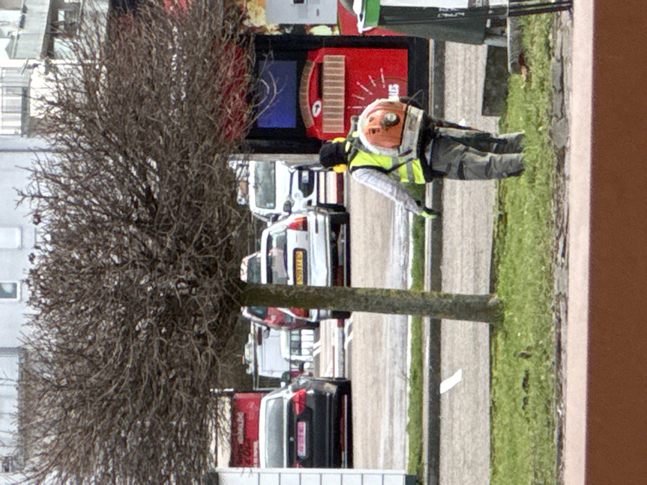 This image, taken in Oberhausbergen, France, depicts an outdoor urban or suburban scene under overcast conditions. A person is visible in the mid-ground, walking rightward on a strip of green grass. The individual is viewed from behind, wearing a high-visibility yellow-green vest over a grey long-sleeved shirt, grey work trousers, black gloves, and yellow ear protection over a black cap. An orange and white Stihl backpack leaf blower is secured to their back. To the left of the person and centered in the frame, a bare-branched deciduous tree with a rounded canopy grows from the grass strip. Behind the grass and person, an asphalt parking lot is visible, occupied by several parked vehicles. On the left, a black sedan with a red French license plate (AW 001 FB) is parked. To its right, a silver hatchback with a French license plate (5931 YY 67) is also parked. Other vehicles, including a red car, a white van, and a white SUV, are visible further in the background. To the right of the tree and behind the person, a red and dark blue self-service kiosk or vending unit stands, featuring vertical slits on its red lower section. In the far background, multi-story buildings with visible windows line the horizon. The foreground consists of a reddish-brown horizontal barrier or planter box.
