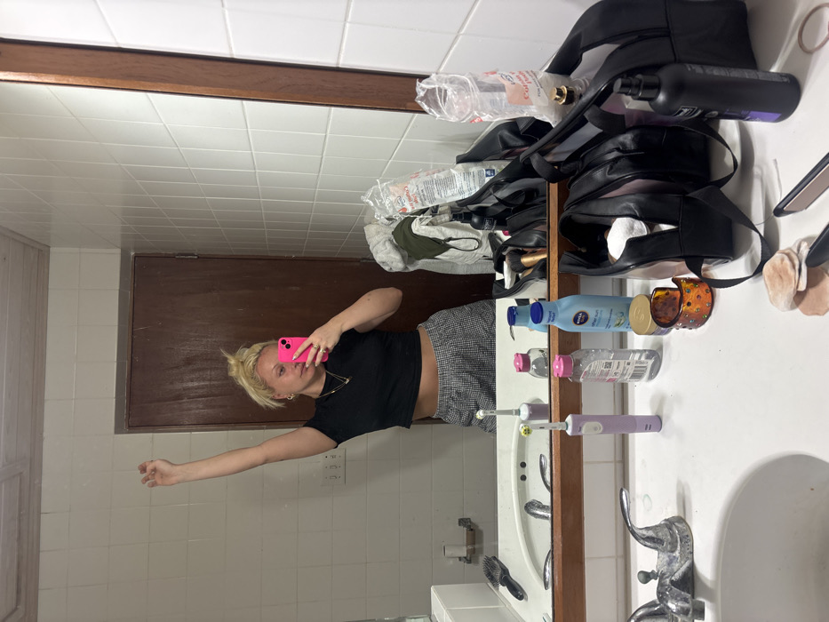 This image depicts a mirror selfie taken by a woman in a bathroom located in Olde Yard Village, British Virgin Islands
