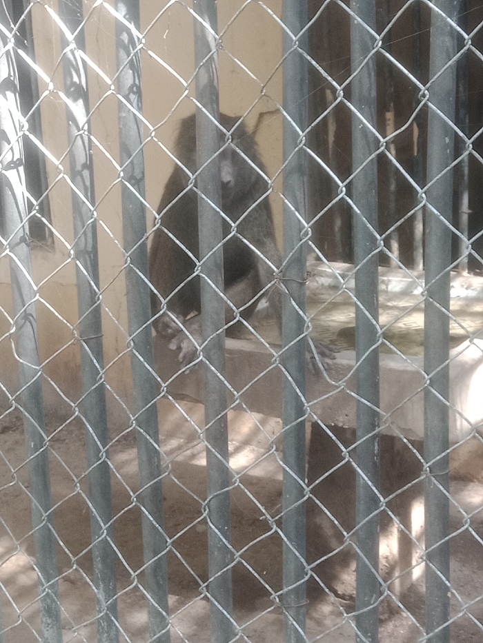 This image, taken in Garun Gawa, Nigeria, shows a dark-furred primate, resembling a baboon, contained within an enclosure