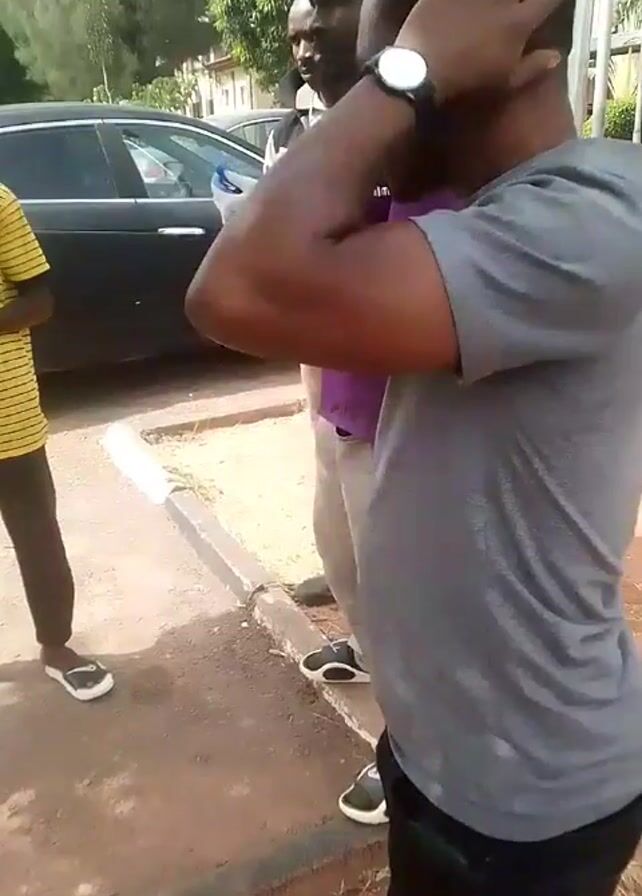 The video depicts a group of four men standing outdoors near a black car parked on a paved surface. The man in the foreground is wearing a grey t-shirt and black pants, holding his head with his right hand. Beside him, another man wears a purple shirt. As the video continues, the foreground figure moves to reveal a man in a long, light grey patterned shirt and pants. Another man is visible in an orange shirt and light pants. A fourth man in a yellow and black striped shirt is looking at his phone. The setting appears to be a residential area. The men are engaged in conversation.