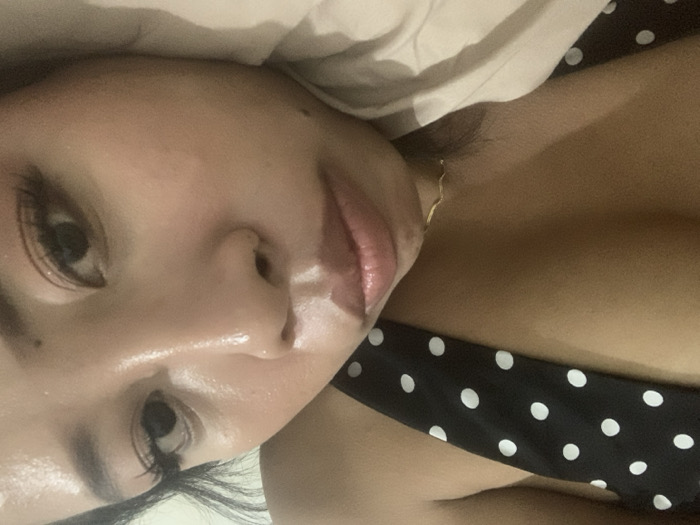 A close-up, angled image displays an individual, identified as likely female, lying down. The subject's head is tilted to the left, with the face oriented towards the camera. The face shows dark eyes with visible eyelashes, a prominent nose, and partially open, glossy lips. The skin on the face appears moist or reflective. Dark hair is visible around the top of the head. The subject is wearing a dark garment with white polka dots, visible over the upper chest area. A thin, gold-colored chain is present around the neck. The individual is resting on a light-colored, soft surface, consistent with bedding or a pillow, which occupies the lower right portion of the frame. The background behind the subject's upper body is dark and indistinct. The environment appears to be an indoor setting. The specific location within the city of Denpasar, Indonesia, cannot be determined from the visual evidence provided in the image.