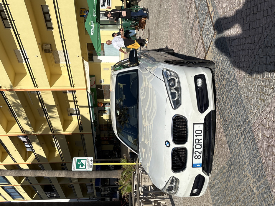 A white BMW 1 Series (F20/F21) with Portuguese license plate "82 QR 10" is parked on a cobblestone street in Quarteira, Portugal