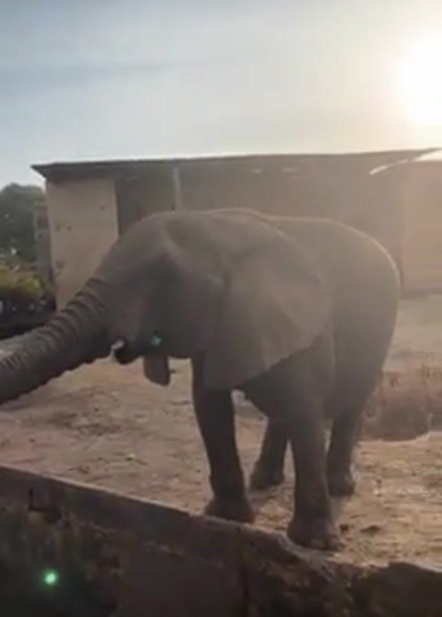 n elephant standing in an enclosure at what appears to be a zoo or park. The elephant is grey, with a long trunk, and is facing the camera with its head slightly lowered. It has a green object in its mouth. The enclosure has a concrete wall separating the elephant from a crowd of people watching. Behind the elephant, there's a low building with a shed-like extension and trees in the background. The sun is bright and high in the sky, creating a strong backlight. Several individuals are seen in the foreground watching the elephant, including a child with braided hair wearing sunglasses. The overall scene appears to be a casual observation of the elephant by visitors.