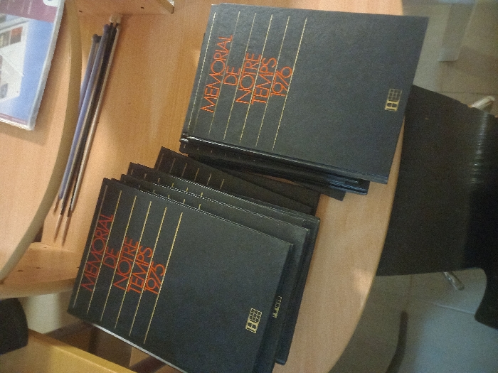 A stack of black books, titled "Memorial De Notre Temps 1975", lies on a light wooden surface