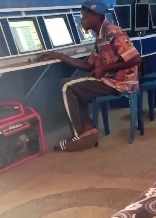 A man wearing a colorful button-down shirt, dark pants with white stripes, Adidas sandals, and a blue baseball cap, is sitting on a light blue plastic chair in front of a row of computer monitors. He is operating a computer at the station, focused on the screen. To his left is a red and black Firman generator. The walls of the room are blue. The floor is patterned with concentric circles. The bottom corner of the shot contains a patterned cloth.