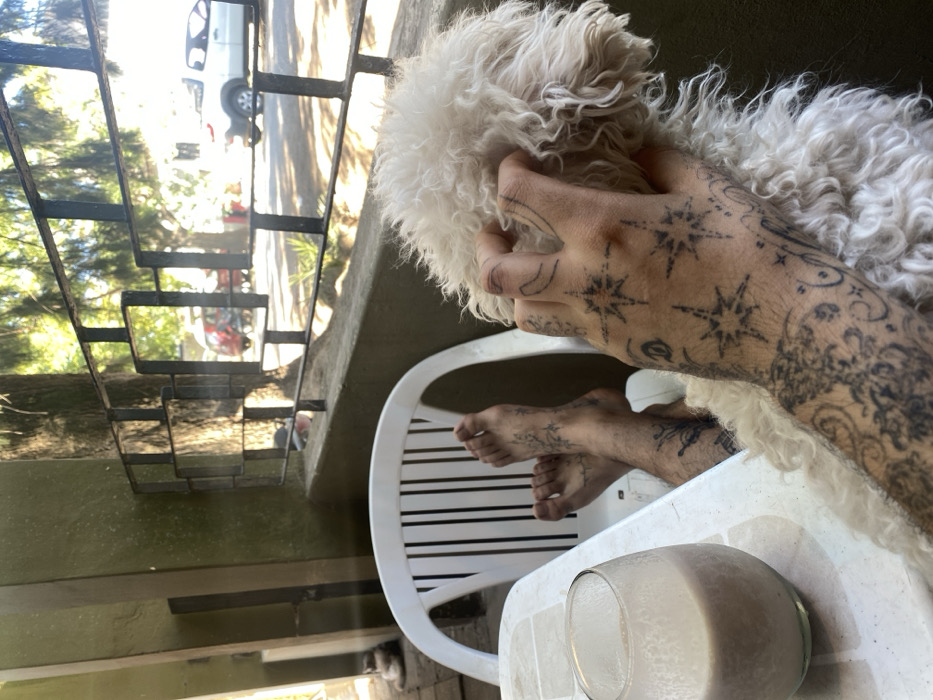 A person with tattoos on their hands and feet pets a white, fluffy dog outside. The person is sitting in a white plastic chair at a white table with a glass of a light-colored liquid on it. A wrought iron railing is visible in the background, with trees and a street scene beyond. The overall image appears to be taken on a sunny day.
