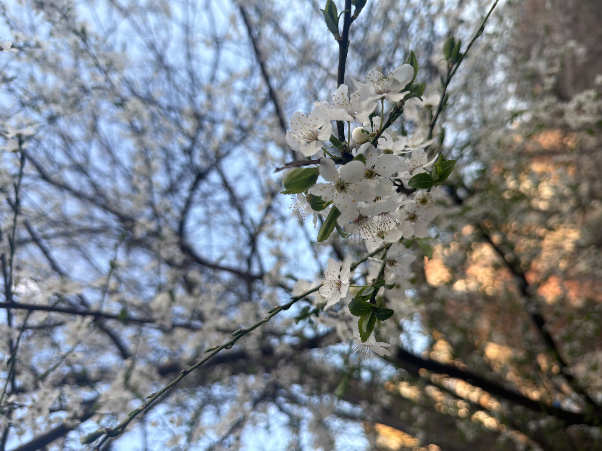 A close-up photograph depicts a cluster of white blossoms and small green leaves on a thin, dark branch, sharply in focus. Each blossom features five white petals and a central cluster of yellow-brown stamens. At least one tightly closed, pale green bud is visible among the open flowers. The background is extensively blurred, showcasing additional white blossoms on other branches of a tree or trees, set against a clear, light blue sky. In the lower-left and mid-left blurred background, distinct circular bokeh patterns in warm golden and orange hues are visible, suggesting diffused light reflecting off an unseen structure or foliage. The scene captures a springtime environment in the city of Plovdiv, Bulgaria. No individuals or specific actions are depicted.