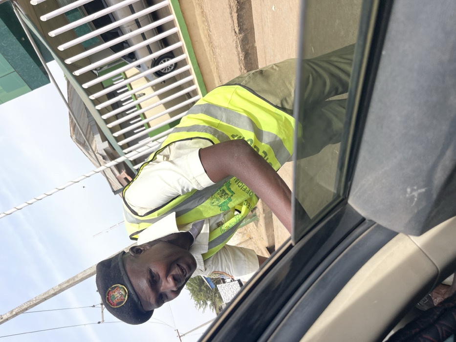An adult male stands outdoors in Jushi, Nigeria, leaning into the open passenger-side window of a vehicle, captured from an interior perspective. The man, with dark skin and a slight smile, wears a black beret featuring an insignia, a light-colored short-sleeved shirt, olive green trousers, and a bright yellow reflective safety vest bearing "FRSC OFFICIAL" and a green emblem. His right arm extends into the vehicle. The immediate foreground shows the dark frame of the vehicle's window and a tan interior door panel. The background reveals a dirt roadside, a concrete curb, and a white vertical-bar metal fence running parallel to the street. Behind the fence, a building with a light-colored wall is partially visible, along with a silver sedan parked. A second building with a green facade rises behind the first. A utility pole with wires is visible on the far left under a clear, bright sky.