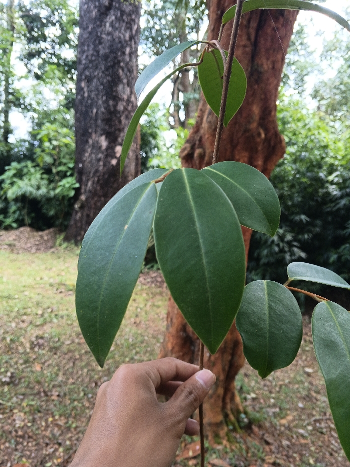 The scene captures a right hand with medium-brown skin grasping the slender, brown stem of a plant. The plant exhibits dark green, oval-to-lanceolate leaves with visible central veins, arranged along the stem. A large tree with reddish-brown, textured bark stands out of focus in the mid-ground, positioned behind the plant. To the left, a darker-barked tree is similarly out of focus. The ground is covered with sparse grass and leaf litter. Dense green foliage and a bright sky form the distant background, indicating a wooded or park environment in the city of Unknown, Vietnam.