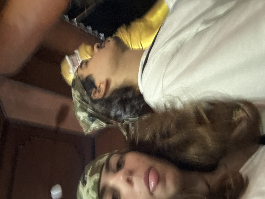 The scene depicts two individuals in an indoor or covered setting within the city of Pai, Thailand. The person on the left, occupying the foreground, presents with long, wavy brown hair, a camouflage-patterned bandana covering the forehead, and a white upper garment. This individual's face is partially visible, looking directly forward, with the tongue extended past the lips. To the right and positioned slightly further back, a second individual is observed, also wearing a camouflage-patterned bandana and a white upper garment. This individual displays long, dark, wavy hair and is oriented with their profile facing upwards and to the right, mouth partially open. The overhead background consists of dark reddish-brown structural elements. Behind the right individual's head, a large, blurry, bright golden-yellow object is visible, consistent with a decorative or monumental feature.