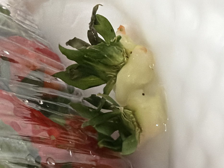 A close-up shot focuses on the top of strawberries still in a plastic container. The berries themselves are visible under the plastic wrap, exhibiting a red hue. Above, the green sepals and the stem-end of the strawberry are evident, exhibiting a pale, almost translucent appearance. A few of the green leaves show signs of discoloration. The overall presentation suggests the berries are slightly wet or condensed.