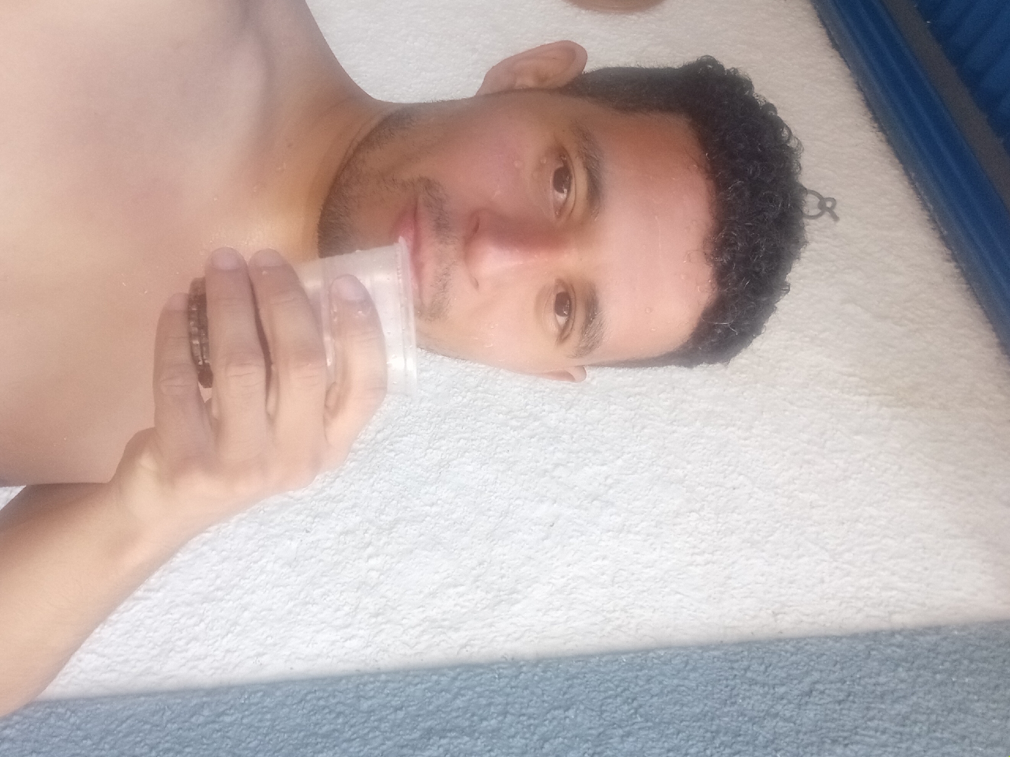 A close-up image depicts a shirtless man with curly dark hair and light brown skin lying on a white textured surface. He is holding a clear plastic cup to his lips, suggesting he may be drinking from it. The background is a combination of white and blue-grey textures. The location is unknown.