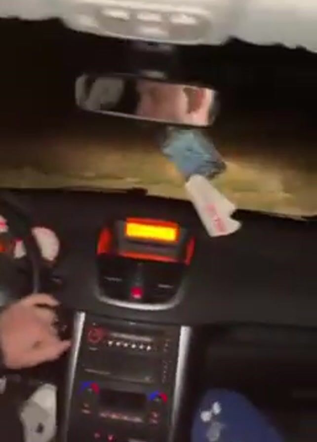 interior of a car driving at night. The driver is visible, holding the steering wheel with his left hand. A passenger is in the front seat; their legs and feet are visible. The car dashboard is visible, with glowing orange and blue lights. The car appears to be driving on a dark road with trees on either side. The video appears to be taken from inside the car, looking towards the front windshield. The interior lights are on. The car seems to briefly skid at one point, causing the camera to jolt upwards.
