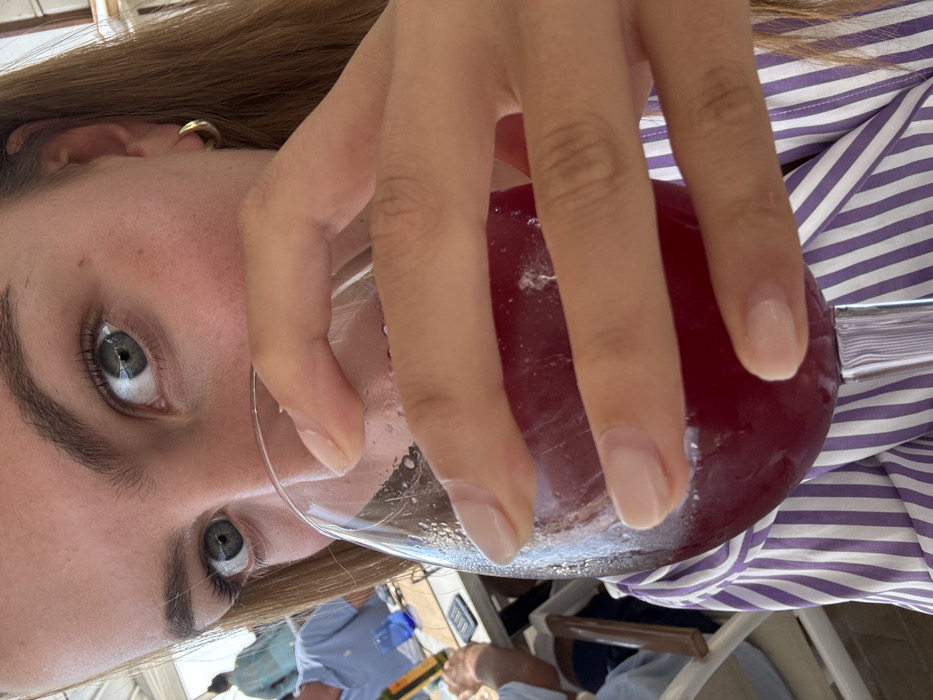 The image presents a close-up, eye-level perspective of an individual holding a condensation-covered wine glass containing a dark red beverage, presumably drinking from it. The primary subject has light-colored eyes (blue-grey) and light brown hair, wearing a purple and white striped shirt and a small gold hoop earring in their right ear. Their fingers, with light natural-colored nails, wrap around the glass. The background, largely out of focus, reveals a casual dining environment consistent with a restaurant or cafe in Sant Elm, Spain. In the blurred mid-ground, another person wearing a light blue collared shirt is seated at a table, with a dark bottle and a blue glass visible. Further back, a third blurred individual is partially visible, appearing to wear a light green or teal garment. The lighting is bright, suggesting a daytime scene in an open or semi-open-air setting.