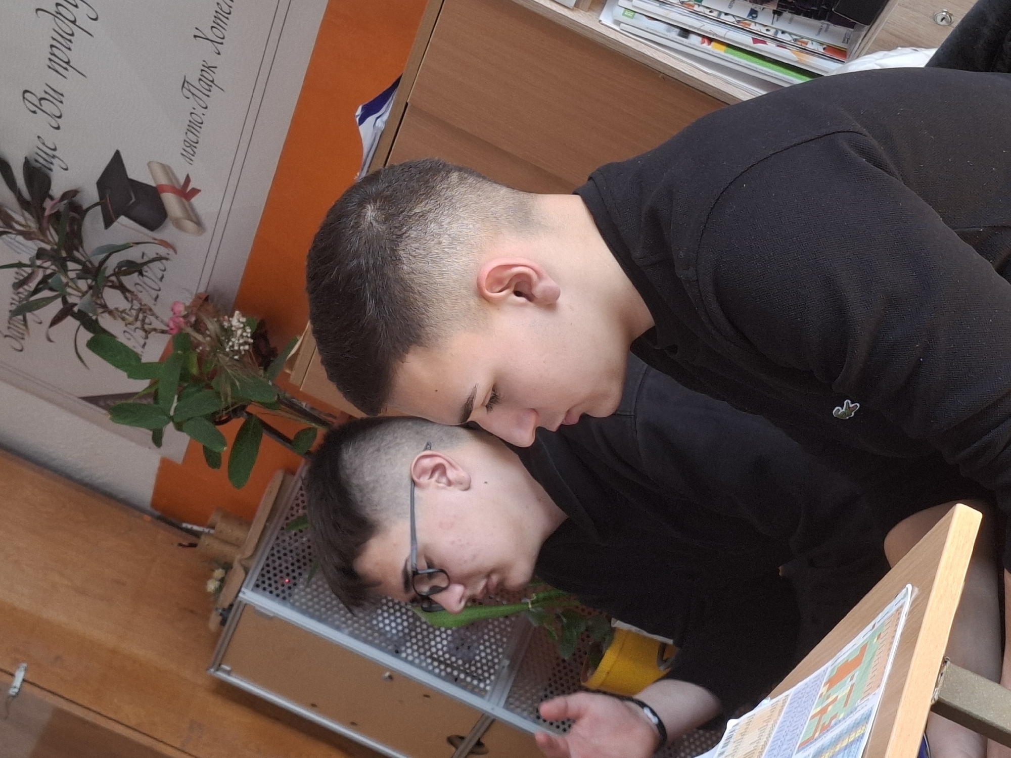 The image portrays two young males seated at individual desks within an indoor environment in Panagyurishte, Bulgaria