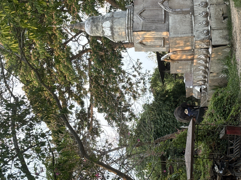 The scene, located in Muang Pattaya, Thailand, depicts an outdoor environment during daylight. A multi-tiered, light grey concrete stupa occupies the midground to the right, featuring a domed top, several arched decorative niches, and a base adorned with lotus petal motifs. Direct sunlight illuminates the right side of the stupa. To the left, a dark-colored elephant is partially visible amidst dense green vegetation. An individual wearing a straw hat and blue clothing is positioned near the elephant. In the foreground to the left, a portion of a three-wheeled utility vehicle with a brown canopy is visible, partially obscured by thick green foliage and undergrowth. In the background, numerous large trees with full green canopies and some visible blossoms frame the upper portion of the image. A simple, open-sided structure with a dark roof is also visible behind the elephant. The ground in the immediate foreground and leading up to the stupa appears unpaved.