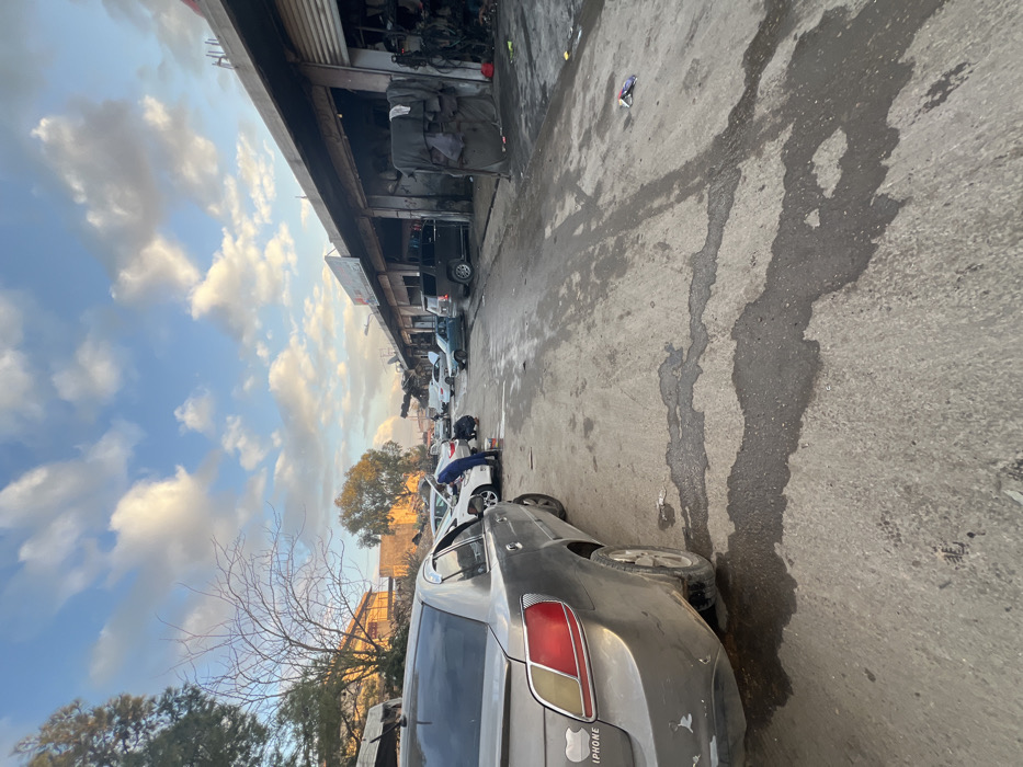 This image displays a daytime street scene in At-Tall, Syria, within what appears to be an industrial or automotive repair district. The concrete or asphalt street is stained with dark, wet patches and exhibits minor debris. In the immediate foreground on the left, the rear-left portion of a silver-grey sedan is visible, featuring an "IPHONE" sticker below its left taillight. The vehicle's body shows cosmetic wear. Further down the street, a white sedan is parked with its hood open. An individual, dressed in a blue jumpsuit, is leaning over the engine compartment, actively engaged in mechanical work. A red bucket and a black trolley are positioned near this vehicle. Additional cars are parked along the left side of the road, backed by trees with sparse foliage and light-colored buildings in the distance. The right side of the street is lined with single-story commercial buildings, likely workshops or garages, characterized by open roll-down metal doors. The interiors are cluttered with various items, suggesting storage or auto repair activities. Dark fabrics or tarps hang near the entrance of one structure. Exposed rebar protrudes from the roofline of these buildings. Further along the street on the right, a dark SUV and a light blue sedan are visible among other vehicles. The sky overhead is blue with scattered white cumulus clouds.