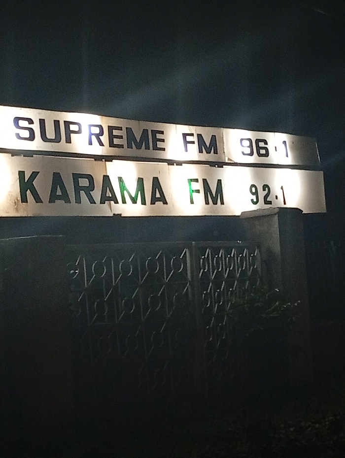 The image depicts a nighttime scene in Shaba, Nigeria, featuring two illuminated signs positioned above a dark, patterned fence. The upper sign displays "SUPREME FM 96.1" in dark, reflective lettering on a light-colored background. Below it, a second sign reads "KARAMA FM 92.1," also in dark, reflective lettering on a similar light background, with a greenish tint visible in the text. Both signs exhibit glare from an unseen light source. Below the signs, a dark metal fence or gate with a repeating geometric circular pattern is visible. Faint, dark vegetation is discernible behind the right portion of the fence. The overall environment is dark, suggesting night, with artificial illumination focused on the signs. No people are visible.