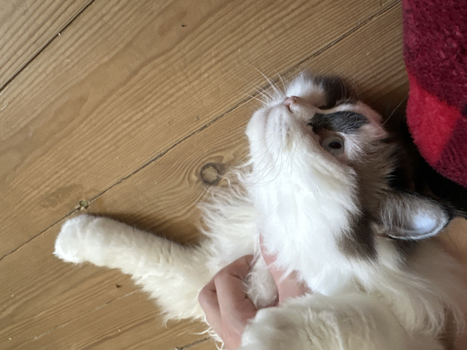 - "The image depicts a long-haired cat, primarily white with distinct grey-brown markings on its face, lying on its back on a light-colored wooden floor" by FM-ep2rc2, licensed under CC BY 4.0