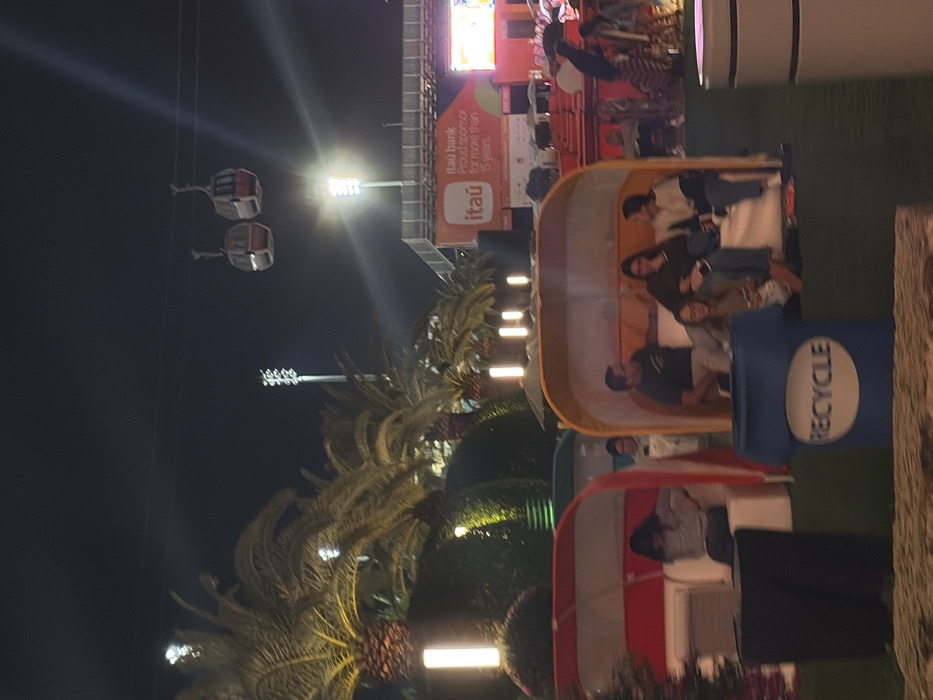The image captures an outdoor nighttime scene at the Hard Rock Stadium complex in Miami Gardens, Florida, United States of America. The area is illuminated by numerous artificial light sources, including stadium floodlights and decorative vertical light poles, creating lens flares. In the immediate foreground, a dark, textured surface is visible. The mid-ground features a green, possibly artificial turf, surface. On the left, a red and white semi-enclosed seating pod contains one individual, likely a female with dark hair wearing a grey top, seated with her back partially to the camera. A dark rectangular object rests in front of her. Centrally, a blue t-shirt-shaped recycling bin with the word "RECYCLE" in white is positioned. To its right, an orange and white semi-enclosed seating pod houses five individuals. A male in a dark shirt and glasses is seated on the left, next to two females, one in a dark top and another with dark hair, who appear to be interacting. A fourth female with light brown hair, wearing a patterned top, is seated on the ground within the pod, looking left. A fifth person is partially obscured behind the seated group. All occupants of this pod appear to be in a relaxed state. The background is dominated by lush palm trees and sculpted hedges, illuminated from below. High above, against the dark night sky, two red and white cable car gondolas are suspended. To the right, a large stadium or event structure is visible, featuring a prominent banner that reads "Itaú bank proud sponsor for more than 10 years" in white text on an orange background. Additional bright floodlights and an illuminated screen displaying colorful graphics are also present, alongside what appears to be red tiered seating or event infrastructure.