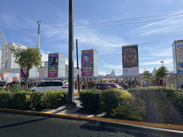 A street scene shows a large outdoor event with tall advertising billboards for musical acts, including Foo Fighters and Tiesto. People are gathered near a fence-like structure, potentially waiting in line to enter the event. A white minivan and a red car are visible in the street. A Ferris wheel and a tall amusement ride are in the background next to a hotel. Shrubbery lines the bottom of the image, partially obscuring the sidewalk.