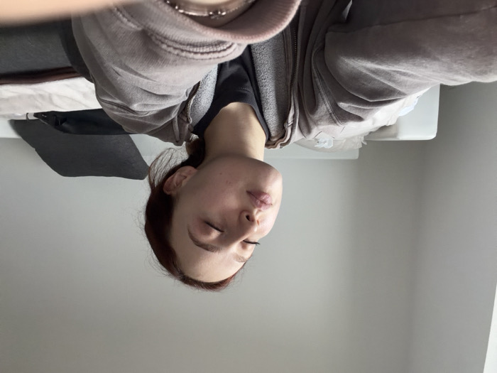 A woman with closed eyes is pictured from a high angle. She has fair skin, dark red hair pulled back, and is wearing a gray hoodie over a dark top. She appears to be indoors with a white wall in the background. Part of a bed with a dark blanket and white sheets is visible in the top left corner. A white fixture, possibly a sink, is partially seen in the top right corner.