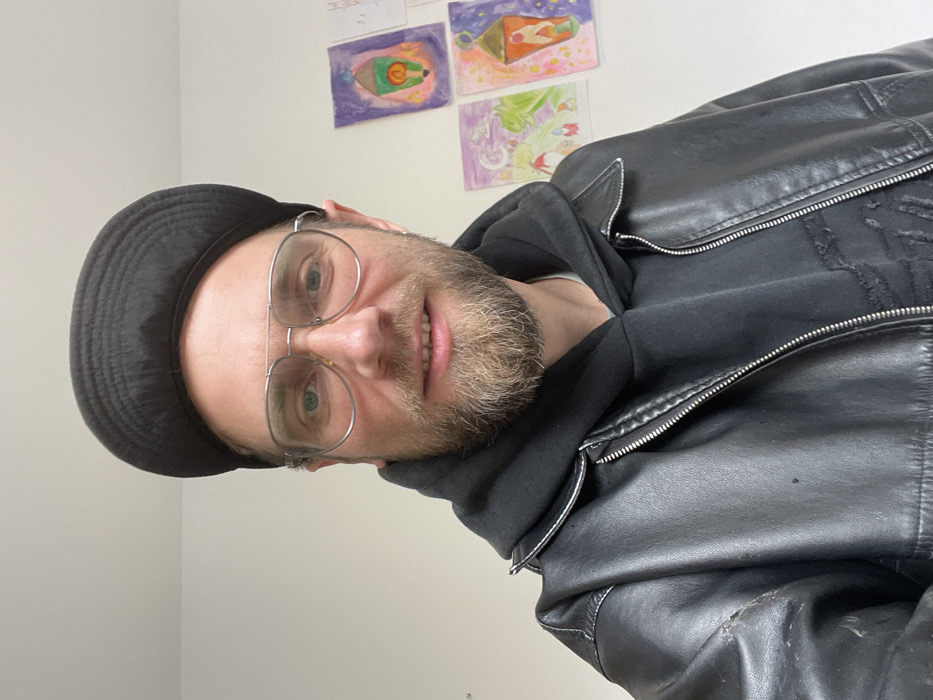 A male subject is depicted in a chest-up, forward-facing view, looking directly at the camera. He wears a black cap reversed, silver-rimmed aviator glasses, and a light-colored beard, displaying a slight closed-mouth smile. His clothing consists of a black hooded sweatshirt under a black leather-like jacket with a zippered front and white stitching along the collar and shoulders. A light-colored garment is visible at the neck. The background is a plain, light-colored wall adorned with several colorful children's drawings, including multiple lantern illustrations and a whimsical scene with a dragon. The scene is located in the city of Podličak, Montenegro.