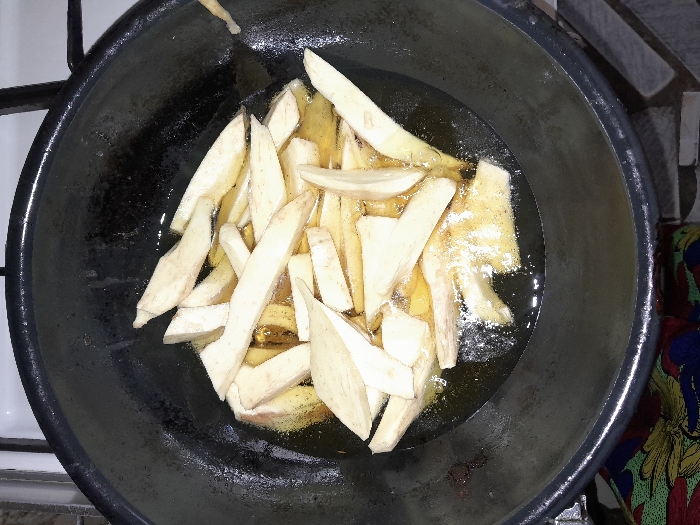 - "The image depicts a close-up, overhead view of white, irregularly cut slices of root vegetable, likely yam or cassava, deep-frying in shimmering oil within a dark, well-used metal wok or deep frying pan" by FM-hE1wJ3, licensed under CC BY 4.0