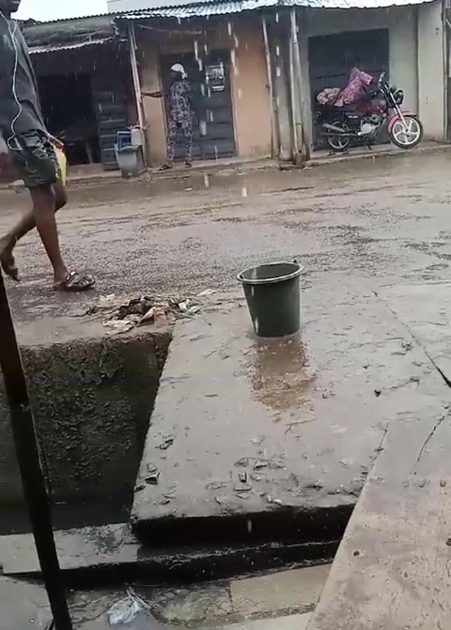 The scene is a rainy day on a street with small shops on either side. The ground is wet and there is standing water on the road. A dark green bucket sits on a concrete surface next to a drainage area. A man wearing a dark shirt, shorts, and sandals walks across the street while wearing headphones. A person in a military-style uniform stands under the awning of one of the shops. A red motorcycle is parked in front of another shop. The video is recorded with a phone; the phone brand and model is watermarked in the corner.
