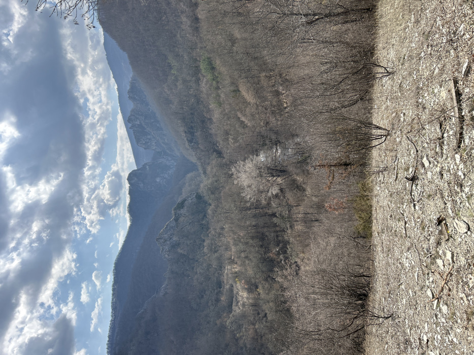 The image depicts a panoramic view of a mountainous valley or gorge, observed from a high vantage point, in the vicinity of Bogoyna, Bulgaria. The foreground consists of dry, light-colored soil covered with small rocks, sparse dry grass, and bare, low-growing shrubs. The midground features a dense deciduous forest, predominantly bare of leaves, indicating late winter or early spring conditions. A river or stream, with a light-colored, possibly icy or frostd-covered bank, winds through the valley floor. Prominent, steep, grey rocky outcrops and cliffs are visible along the valley sides and in the background. Beyond the valley, tree-covered mountain ranges extend into the distant haze. The sky overhead is partially cloudy, with patches of blue sky interspersed with large, bright white and grey cumulus clouds. No individuals, animals, or artificial structures are discernible within the frame.