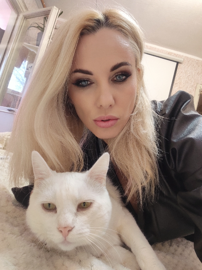 The scene depicts an indoor residential setting located in Sevastopol, Ukraine. An adult female and a domestic cat are positioned in the foreground, likely on a bed or soft furnishing. The female, situated in the upper-right quadrant, has long blonde hair with darker roots, prominent dark eye makeup accentuating blue eyes, and light pink lipstick. She wears a dark, possibly synthetic material, garment with a structured shoulder and directly faces the camera. Below and to her left, a white, short-haired cat occupies the lower-left quadrant. The cat has light green/amber eyes, a pink nose, and visible white whiskers, and its gaze is also directed towards the camera. Both subjects rest on a light-colored, textured, fluffy surface. In the background on the left, a light-colored cabinet with glass doors contains a green potted plant, with a glimpse of outdoor tree branches beyond a window. On the right, a patterned wallpaper covers the wall, upon which a white, partially rolled-up projection screen or roller blind is mounted.