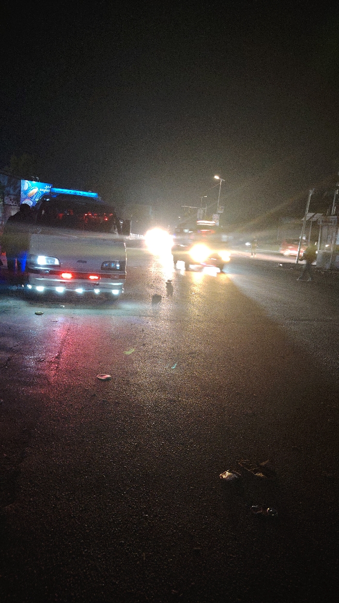 A dimly lit street scene at night. A van with illuminated lights sits on the left side of the road. Streetlights and oncoming car headlights illuminate the background. The road surface appears wet and reflective, littered with debris. A person is standing on the right side of the street. In the background, buildings and signs are visible under the streetlights.