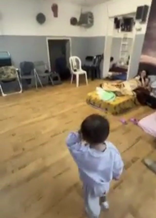 A young child in a light-colored pajama set walks across a room with a wooden floor. The room contains chairs stacked near a wall, a partially opened doorway, and mattresses on the floor with people lying on them. The child is facing away from the camera and appears to be toddling. There are other people present in the room, some of whom are lying down. The room seems to be a makeshift sleeping area, possibly a shelter or temporary living space. The walls are painted gray and white, and there is a large print on one wall. There are various items scattered around, including blankets, pillows, and personal belongings.