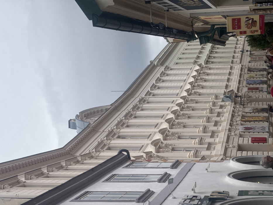 The image depicts a street scene in Baden, Austria, specifically along Kaiser Franz Ring, featuring the Casino Baden. The scene is dominated by three buildings under an overcast, light grey sky. On the far left, a multi-story building with a white facade and grey trim features multiple rectangular windows. A dark green downspout curves downwards from its roofline. A partially visible dark sign with white text resembling "BIES" is affixed to its lower section. In the lower left foreground, the top of a person's head with grey hair is visible. The central and most prominent building is the Casino Baden, a grand, multi-story structure with a light beige/cream facade. Its upper section features a highly decorative cornice and numerous tall, rectangular windows. A prominent light blue/grey metallic dome with an ornate pediment is visible on its roofline. Below these, a series of eleven distinct arched windows are visible, each flanked by ornate pilasters and topped with shell-like decorative elements. Below these windows, a horizontal sequence of approximately eleven square art panels are displayed, featuring abstract designs in colors such as red, gold, blue, and white, including a prominent red heart motif. A dark lamppost extends from the facade between two of these art panels. Several indistinct individuals are visible on the sidewalk in front of this building, one appearing to wear red clothing. On the far right, a building with a lighter cream facade is partially visible, featuring a dark green sloped roof and a dark green gutter. Two light-colored brackets extend from below the gutter. A red banner displaying the "HEINDL" logo and images of chocolates hangs vertically from this building. Green foliage is visible at the very bottom right corner. The perspective is from street level, looking slightly upwards along the length of the street, with the buildings converging towards the background. No specific actions or interactions are clearly discernible beyond general pedestrian presence.