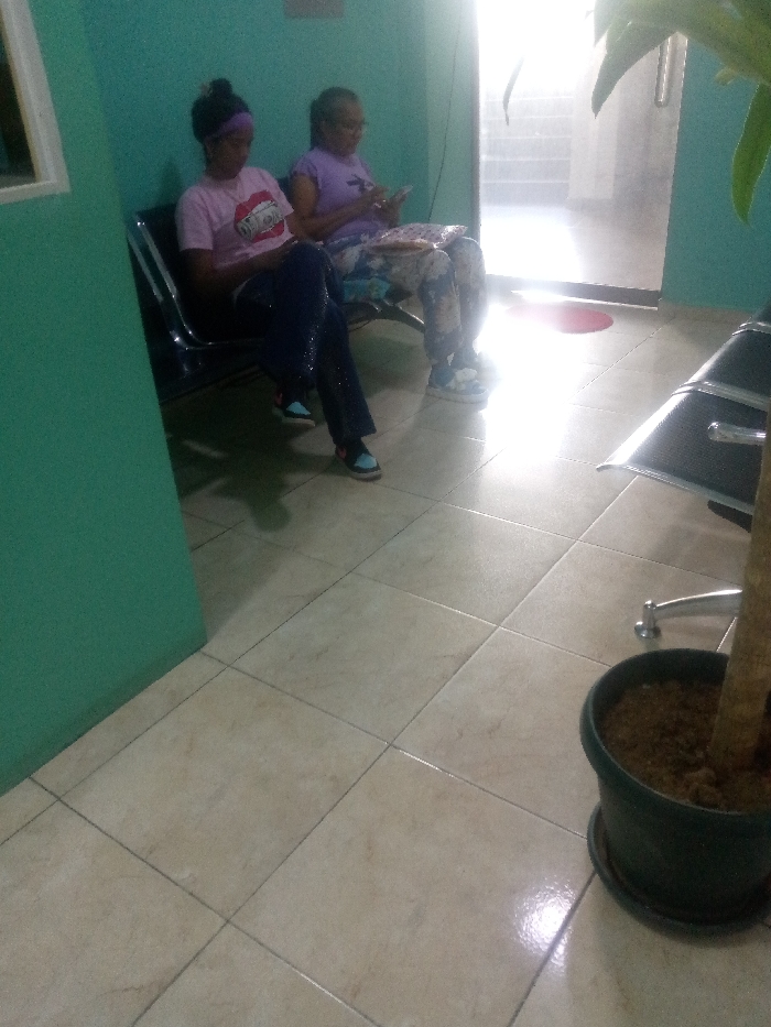 The image displays two adult females seated on a black metal waiting bench in an indoor environment. The specific location within San Carlos, Venezuela, cannot be definitively determined from the visual information provided. The individual on the left has dark hair pulled up with a purple headband and is wearing a light pink t-shirt with a graphic design, dark blue or black sparkly pants, and blue/black sneakers. She is looking down at a mobile device held in both hands. The individual on the right, appearing older and wearing glasses, is dressed in a light purple t-shirt and patterned light-colored pants. She is also looking down at a mobile device in her hands and has a patterned cloth or bag resting on her lap. The room features walls painted a teal or aqua green color and a floor composed of light-colored (beige or off-white) square tiles. A strong light source emanates from an open doorway in the background, creating significant glare and partially obscuring a visible staircase or further illuminated area beyond. A red circular mat is positioned on the floor near this doorway. In the immediate foreground on the right, a potted plant with a brown trunk and green foliage is visible within a dark green pot and saucer. A teal-colored wall or partition extends into the frame on the far left. Both individuals appear to be passively waiting, engaged with their personal devices.