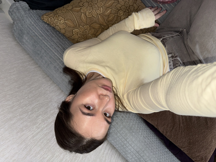 An indoor scene in 3 Госконезавод Центральная усадьба, Russia, depicts a female subject positioned horizontally, appearing to be reclining on a piece of furniture such as a sofa or bed. The subject, a young adult with dark brown hair and brown eyes, is looking directly at the camera. She is wearing a light yellow, long-sleeved top with textured sleeves and grey jeans. A thin gold chain is visible around her neck. Her right arm is extended, indicating she is holding the device capturing the image. Her left hand rests on her abdomen. The immediate environment includes a light grey ribbed pillow on the left, a brown floral-patterned pillow in the upper-left background, and a dark brown or purple pillow in the lower-right foreground. A light-colored, textured surface is visible beneath her head, likely part of the furniture or bedding.