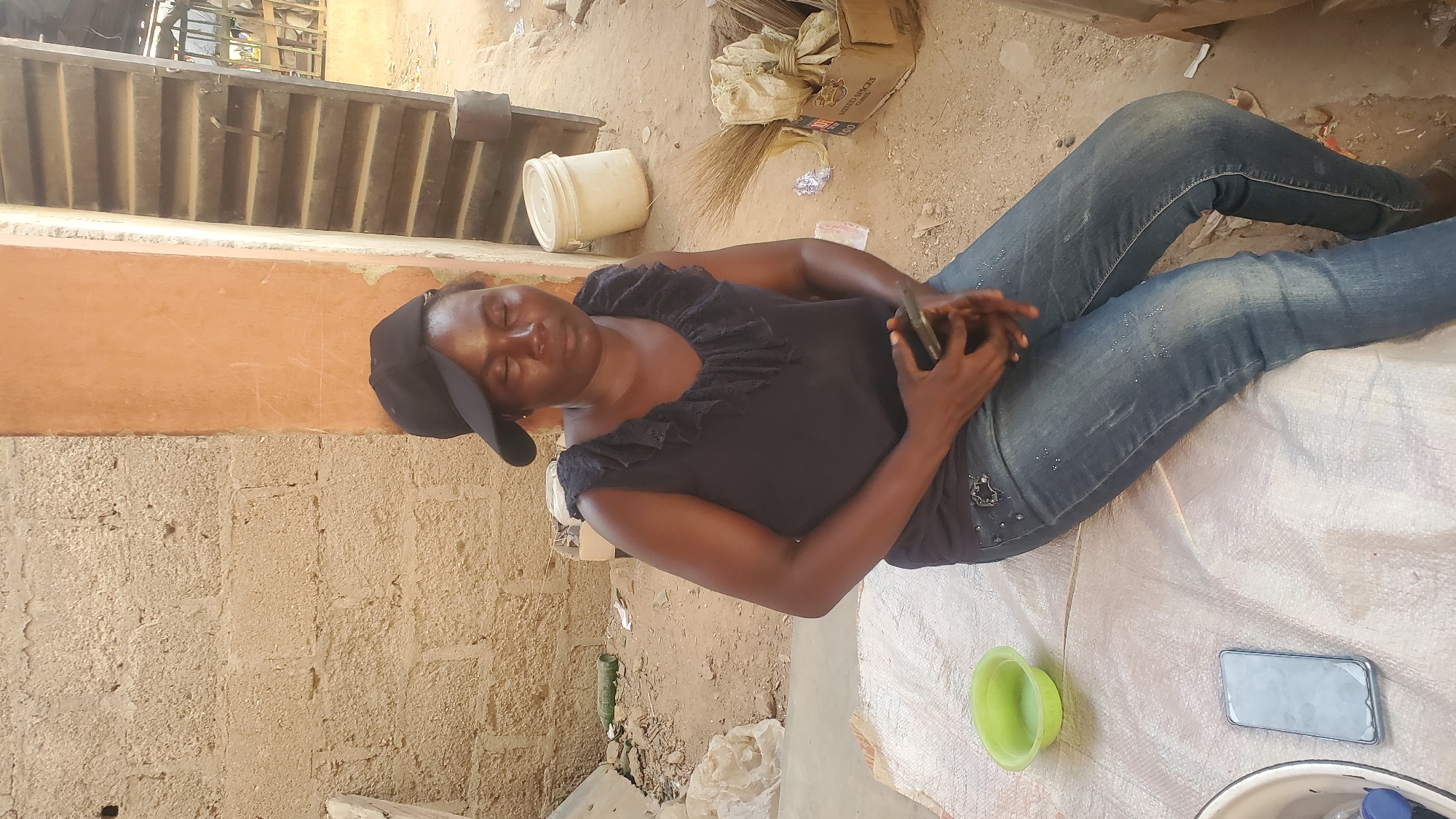 An adult female is seated outdoors on a white woven mat in Akwanga, Nigeria. She wears a black baseball cap, a black sleeveless top with ruffled trim, and distressed blue jeans with embellishments. Her eyes are closed, and she holds a dark-colored smartphone in both hands. A second dark smartphone and a light green plastic bowl rest on the mat to her left. The immediate background features a rough, light-brown concrete block wall on the left and an orange-painted concrete column on the right. The ground is exposed dirt, with a white plastic bucket, a cardboard box labeled "100 SPICES" containing bundled items (possibly brooms), and scattered debris visible behind the column. A partially open dark metal gate is present further in the background. The scene is illuminated by natural daylight.