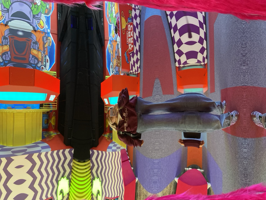 The image, presented rotated 90 degrees clockwise from its likely upright orientation, depicts a young female taking a selfie in a highly reflective and visually distorted indoor environment, identified as an entertainment center or interactive exhibit in Krasnoyarsk, Russia. A blonde-haired female, appearing significantly elongated and widened due to the mirror's curvature, is visible in the lower right portion of the frame. She holds a light-colored smartphone in her right hand, pointed towards her reflection to capture the image. She is dressed in a maroon quarter-zip sweatshirt with a white collar, light-wash blue denim jeans, and light-colored slip-on footwear. A dark shoulder bag is carried on her left side. The surrounding environment consists of multiple reflective surfaces creating a fractured and disorienting perspective. Dominant patterns include white with purple zigzags, purple and white checkerboards, and large, irregular shapes in solid red, purple, and light blue. Cartoon-style graphics, featuring a green turtle-like character and a grey robotic figure, are depicted on large panels. Visible text includes "SUPER GO-KART" within a red box featuring a white and black checkered flag motif, indicating an amusement or gaming theme. Bright red geometric structures, some containing vertical strips of glowing blue light, are integrated into the decor. A large, dark, multi-faceted object, likely a structural element or part of an attraction, is centrally reflected. The floor surface in the foreground beneath the individual's reflection is patterned with grey, purple, and red sections. Bright pink, shaggy, fibrous material lines the extreme left and right edges of the frame, serving as a border or decorative element within the exhibit.